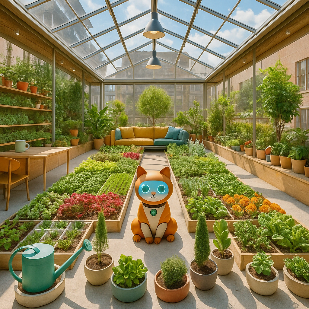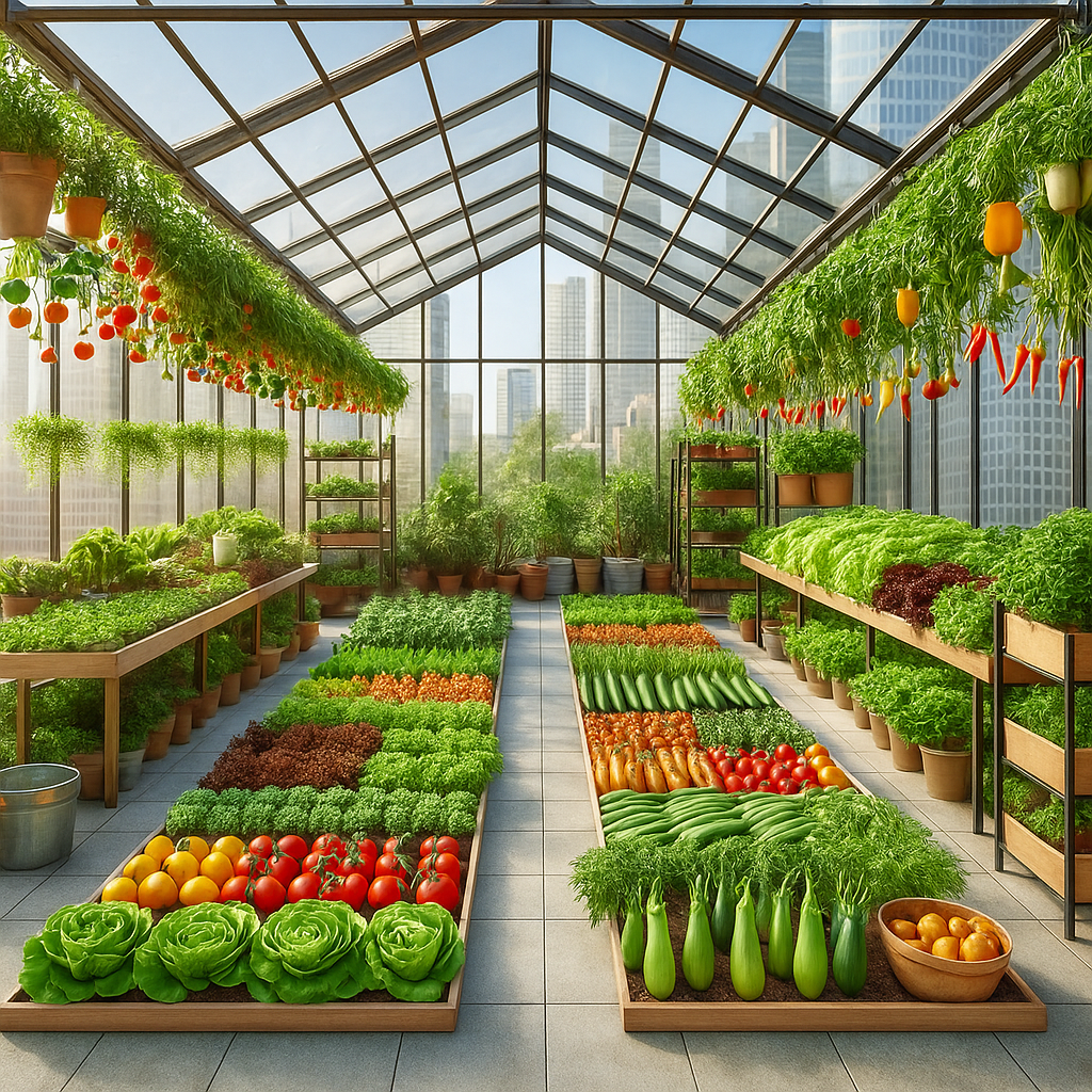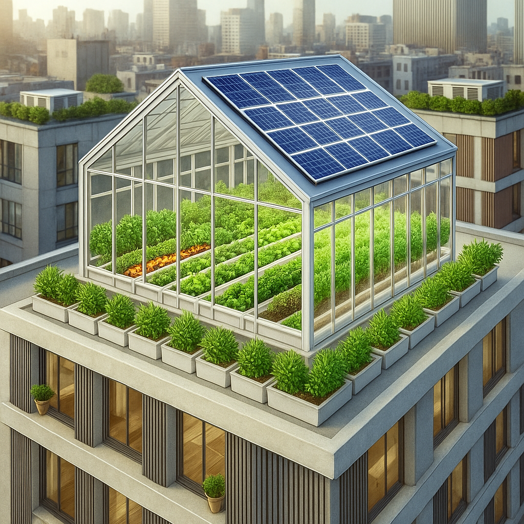 Design a rooftop greenhouse model that grows food and provides a relaxing space for residents