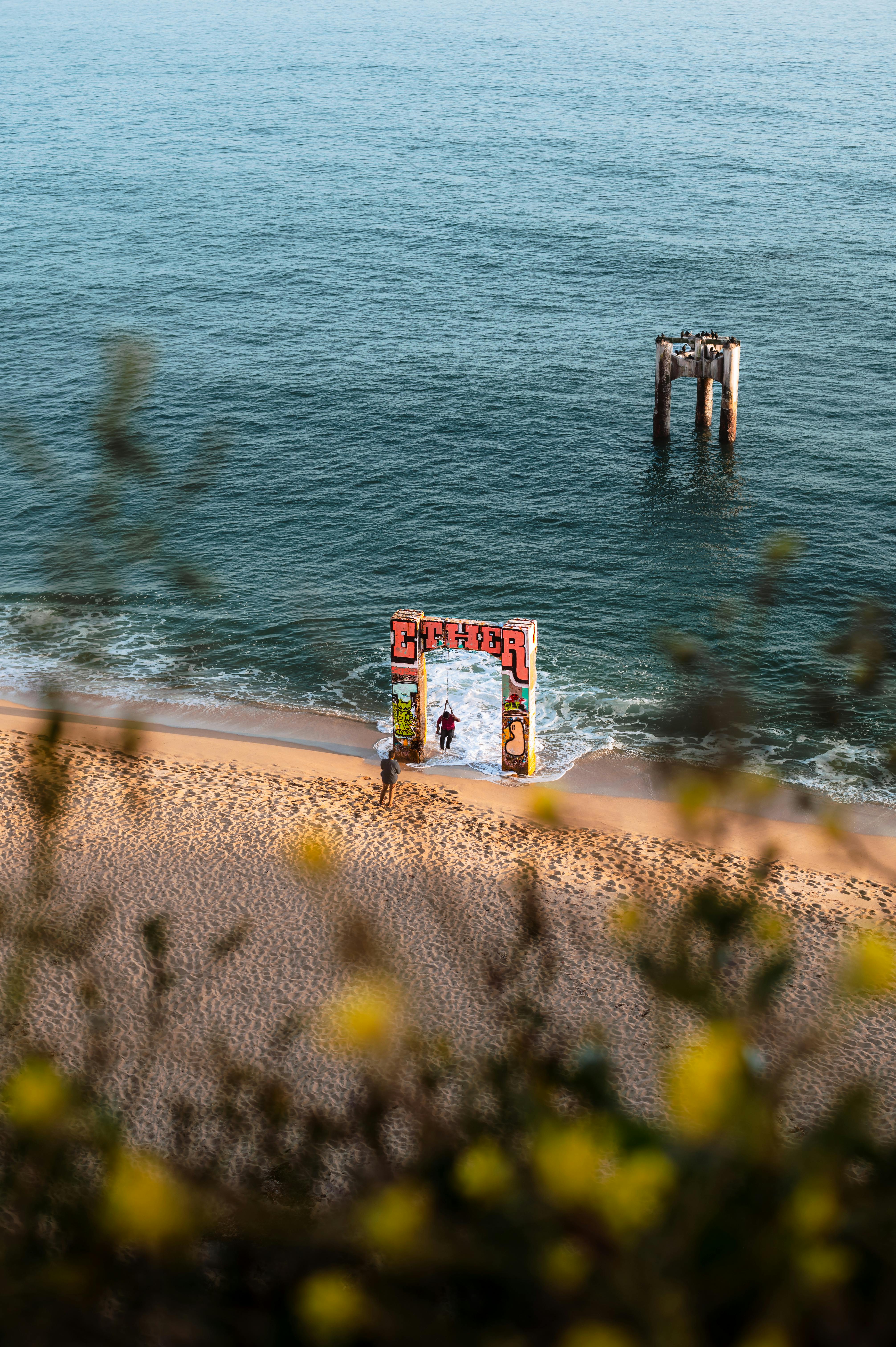 The Davenport Pier swing in California hangs from the remains of a concrete pier arch, creating a dramatic ocean-view swing.